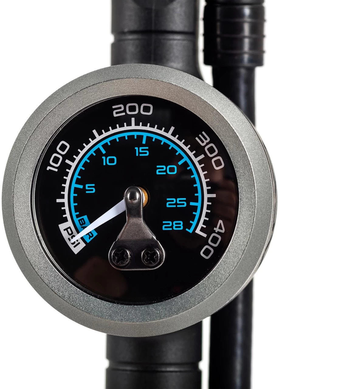 High-End Dämpferpumpe mit 2-stufigem Schrader-Ventilkopf für sicheres Abschrauben ohne Luftverlust. Speziell für höhere Drücke bis 400 psi und mit ergonomischem Natural Fit Griff. Exakte Fahrwerkseinstellung dank Präzisionsmanometer und Luftablass-Ventil zum Feinjustieren.