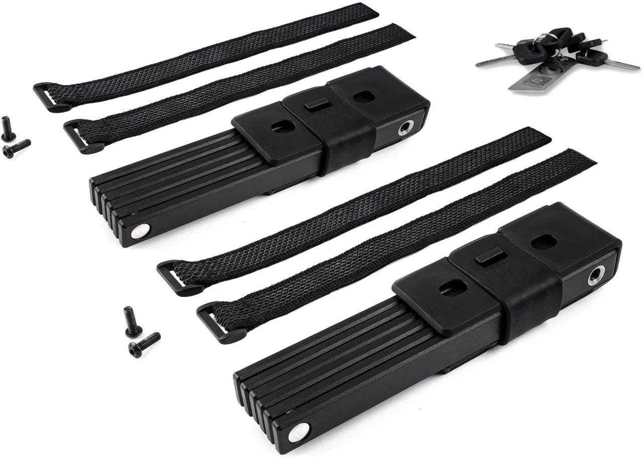 Das ACID RIGID 100 Pure TWIN PACK beinhaltet zwei Faltschlösser, zwei Halter sowie sechs gleichschließende Schlüssel. Die hochsicheren Faltschlösser sind aus speziell gehärtetem rostfreien Hochleistungsstahl gefertigt. Ein solider, gefederter Bolzen sorgt sowohl für eine sehr einfache Handhabung als auch für sicheres Verschließen. Durch das schlichte und schlanke Design ist das gewichtsoptimierte 100 cm lange Faltschloss nicht nur handgerecht und griffig, sondern passt nahezu an jedes Fahrrad. Der flache Halter mit seitlicher Öffnung lässt sich mühelos variabel verschrauben oder mit rutschfesten Klettverschlüssen befestigen. Das Schloss hält durch seine besonders hochwertigen Materialien und die präzise Verarbeitung immensen Aufbruchsversuchen und extremer Witterung langfristig stand. Der perfekte Schutz für jede Situation.