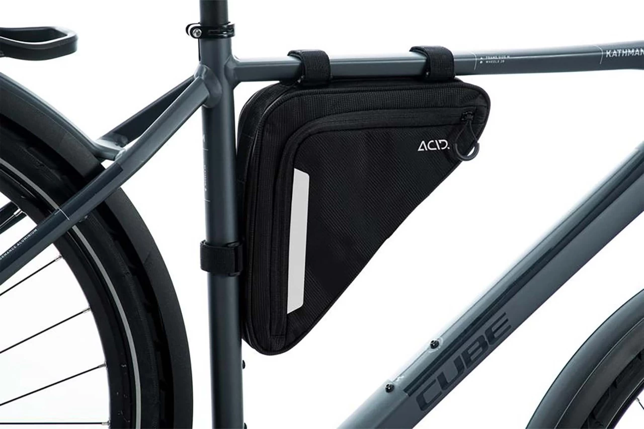 Die ACID Rahmentasche CMPT 2 mit 2 Liter Fassungsvermögen hat alle essenziellen Features, die sie braucht. Das Außenmaterial ist PVC-frei, abriebfest und pflegeleicht. Dank dem umlaufenden Molle-System lässt sie sich mit Straps an verschiedenen Positionen anbringen und passt sich flexibel an den Rahmen an, ohne die Bike-Performance zu beeinträchtigen. Reflektierende Elemente erhöhen die Sichtbarkeit. Im Hauptfach mit Netztasche, Karabinerhaken, Pumpenhalterung und Seitentasche mit separatem Reißverschluss lassen sich die Inhalte übersichtlich und sicher verstauen. Durchdacht ist auch das farbige Innere der Tasche: So kannst du die Tascheninhalte viel besser erkennen als in einem komplett schwarzen Interieur.
