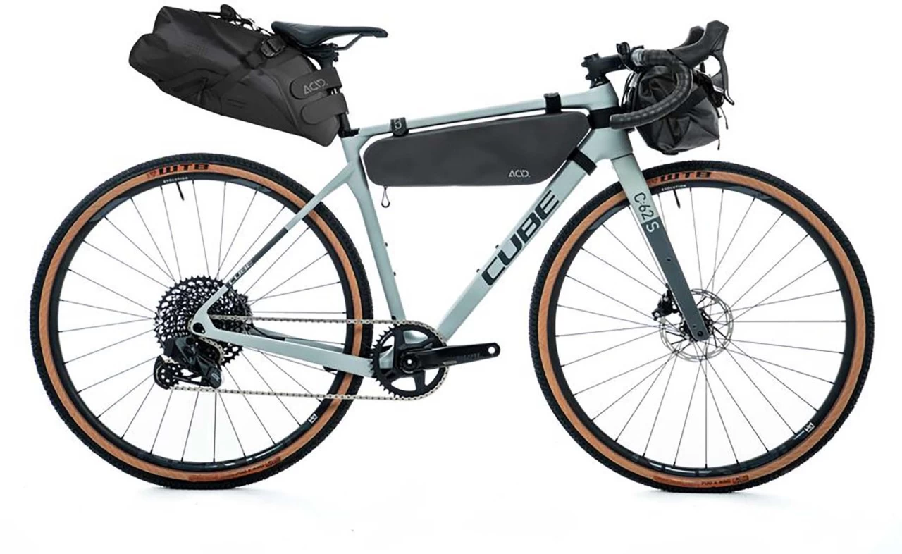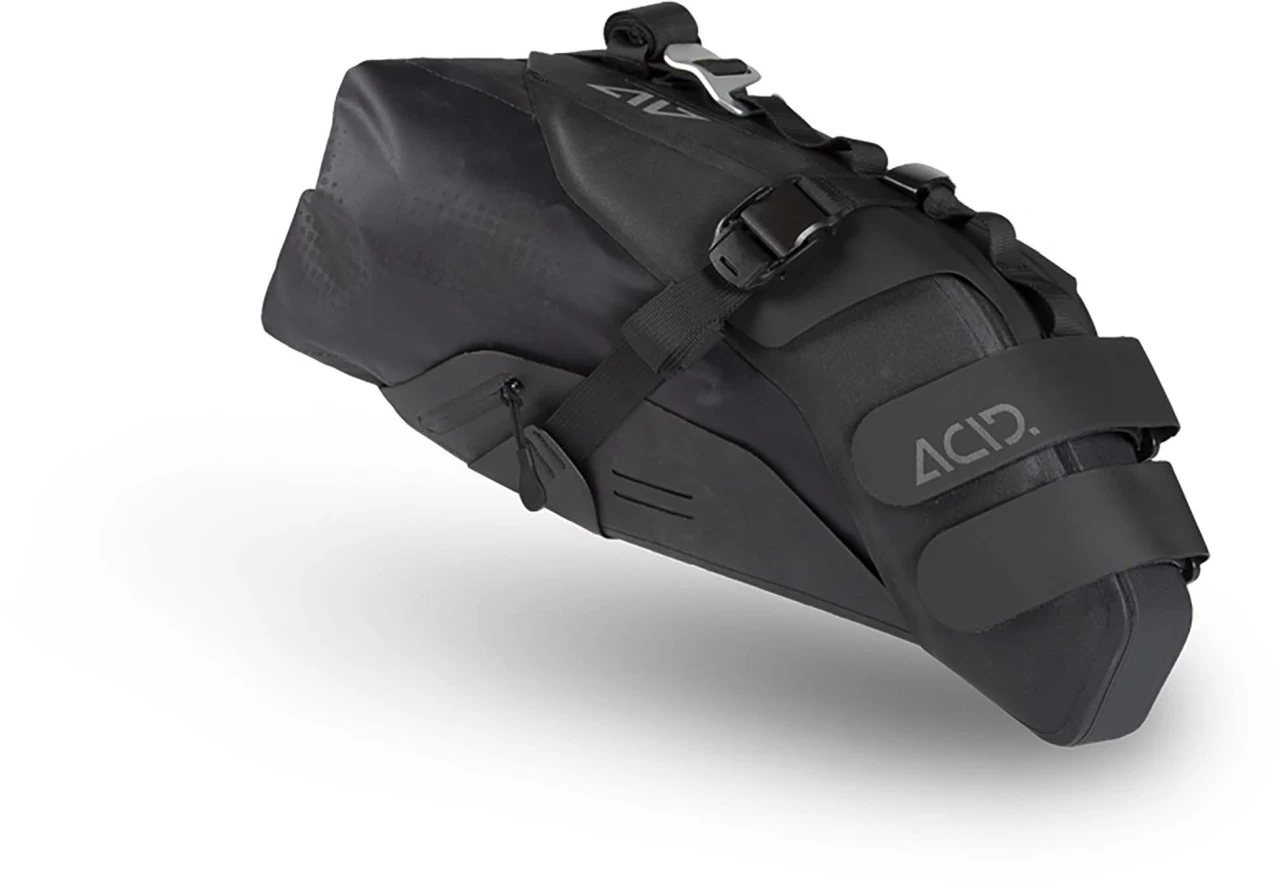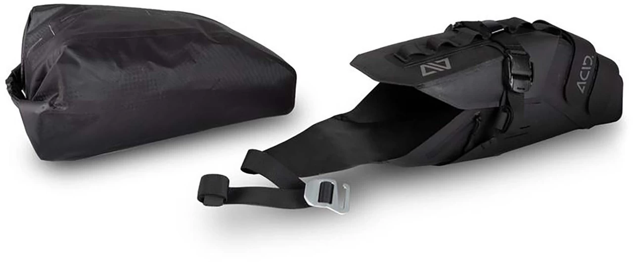 Vom Micro-Adventure bis zur längeren Bikepacking-Tour: Das ACID PACK PRO 11 wurde mit erfahrenen Bikepackern entwickelt. Das zweiteilige System aus Harness und wasserdichter, verschweißter Drybag ist funktionell konzipiert. Dank des flexiblen MOLLE-Systems lässt sich der Harness sicher an Rail und Sattelstütze anbringen und kann auch am Rad verbleiben. Die robuste Dry Bag wird in den Harness gesteckt, fixiert und ist abends oder zwischendurch schnell wieder entnommen. Ein weiteres Feature: Der Tascheninhalt lässt sich durch ein integriertes Entlüftungsventil noch weiter komprimieren. Reflektierende Elemente an beiden Teilen erhöhen die Sichtbarkeit im Straßenverkehr. Auch ein Rücklicht lässt sich problemlos integrieren.