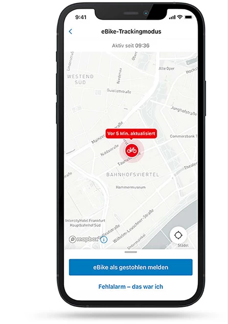 Verfolge den Standort deines eBikes auf dem Smartphone: Sollte dein eBike gestohlen werden und die Funktion eBike Alarm dir eine Benachrichtigung senden, startet automatisch das Tracking. Über die eBike Flow App kannst du den Standort deines eBikes sehen und an die Polizei weitergeben.