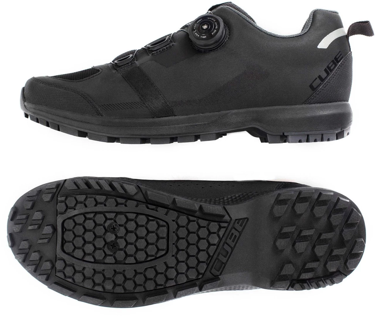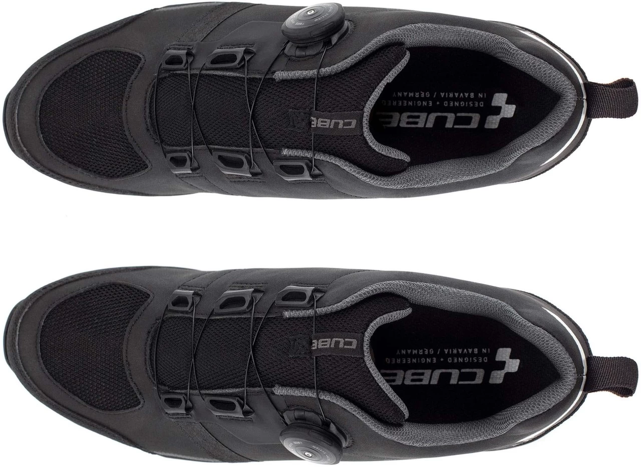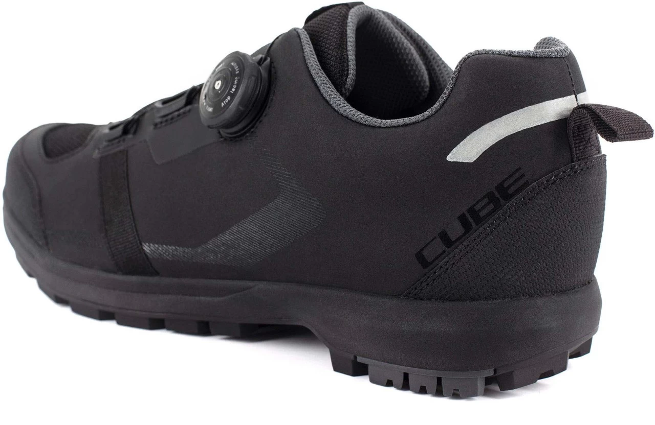 Stylischer All Terrain Schuh mit fortschrittlichem Drehverschluss und toller Passform dank ergonomisch optimierten CUBE Natural Fit Leisten und Innensohle. Clevere Features wie die Einstiegshilfe und der Laceholder machen das Leben leichter, während die griffige Gummi-Außensohle für Klickpedale auch beim Gehen tollen Halt gibt. Das robuste Obermaterial und die verstärkte Zehenkappe schützen den Fuß, dank Luftlöcher und Mesh-Konstruktion bleibt selbiger aber immer angenehm belüftet. Das reflektierende Fersenelement schenkt zusätzliche Sicherheit durch mehr Sichtbarkeit bei schlechten Lichtverhältnissen.