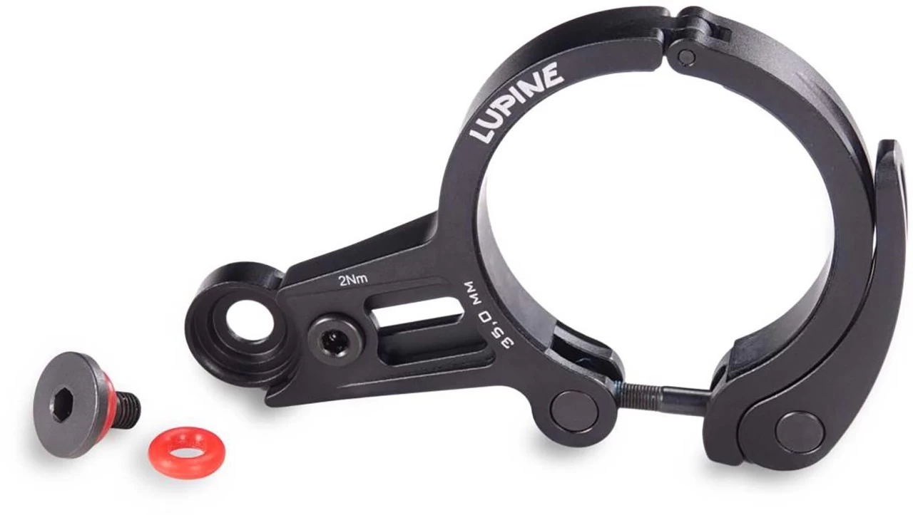 Flexmount Schnellspanner zur Befestigung eines Lampenkopfes an Stangen mit passendem Durchmesser. Er besteht aus CNC-gefrästem und anschließend schwarz eloxiertem Aluminium. Die Gummiauflage verhindert Kratzer und sorgt für festen Halt am Lenker. Geeignet für alle Lupine Lampenköpfe. Abstand vom Befestigungsloch der Halterschraube zum Halterrand minimum ca. 27 mm, maximal ca. 40 mm, Schellenbreite 9 mm.