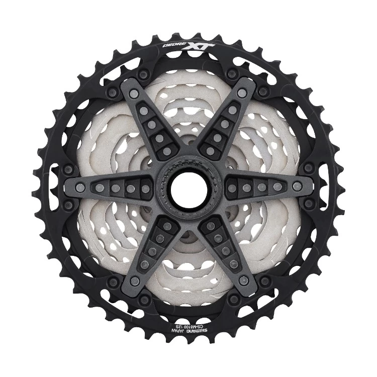 Die neue SHIMANO DEORE XT M8100 12-fach-Kassette spart dank ihrer BEAM SPIDER Konstruktion Gewicht und spendiert zugleich SHIMANOS MTB-Antrieben einen weiteren Gang. Mit SHIMANOs neuem MICRO SPLINE Freilaufkörper und dem HYPERGLIDE+ Zahnprofil sorgen diese Kassetten mit 10-45 und 10-51Z für hochwertige Schaltqualität.